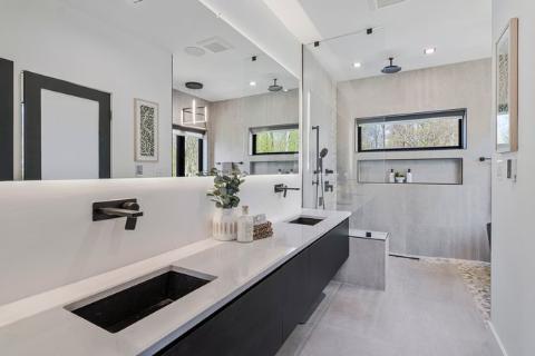 - Upper level has primary suite with walk in closet and spa inspired bathroom. There is also a second primary suite with large dressing area and en-suite bathroom