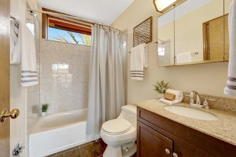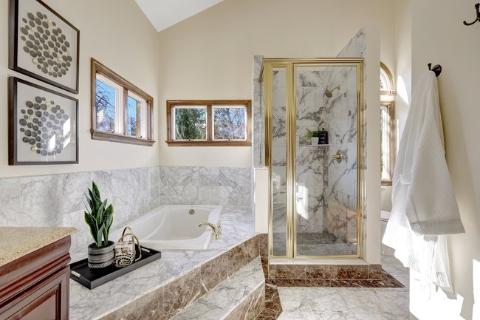 • Primary bathroom with marble tile and skylight
