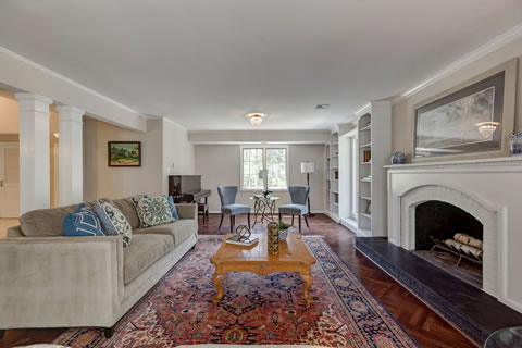 • Living room with custom built in shelves and fireplace